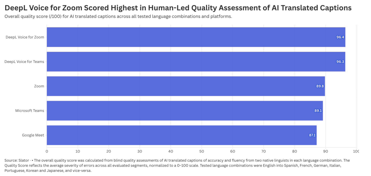 DeepLのすべての機能は、高い正確性と信頼性を基盤にしています。その品質は、第三者評価と専門家による検証の両面で実証されています。リアルタイム音声翻訳に関して実施されたSlatorの最新調査では、DeepL Voiceは翻訳の品質と安定性の両方で他社を大きく上回る結果となりました。専門家の96%が、他の主要サービス(Zoom、Microsoft、Google翻訳)よりも高く評価しています。