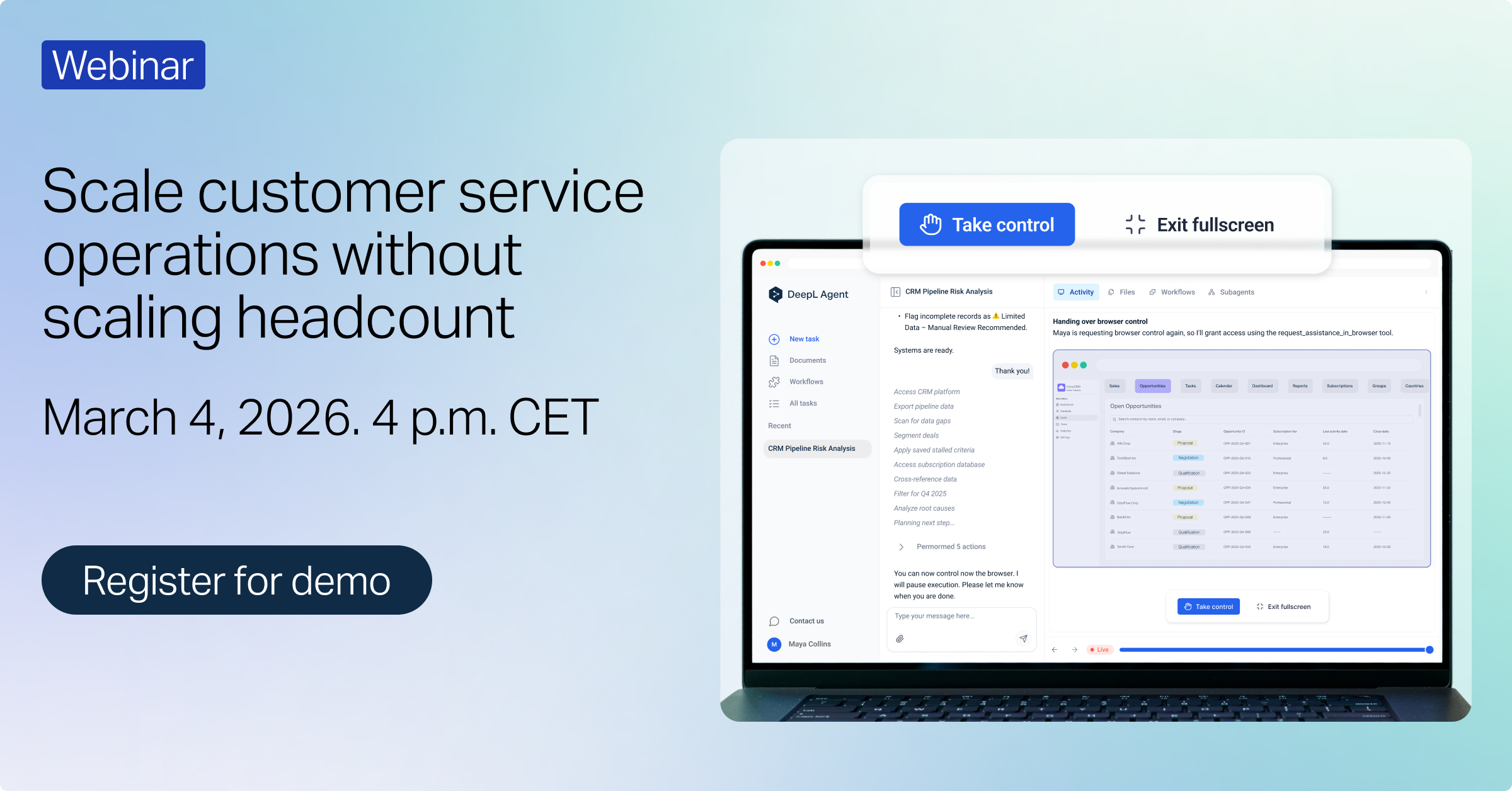 Rutin hayatına veda etmeye hazır mısın? DeepL Agent'ın müşteri hizmetleri ekipleri için neler yapabileceği hakkında daha fazla bilgi edinin ve canlı demoları [burada] keşfedin.